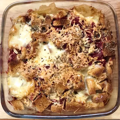 Baked Beetroot pasta with croutons and cheese